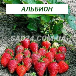 Полуниця Альбіон - кращий ремонтантний популярний сорт виведений в Каліфорнійському університеті. Розсада полуниці нейтрального світлового дня. Кущ розлогий, середньо-рослий із щільним глянцевим листом. Ягода дуже велика 35 - 50гр. максимальна вага може досягати 70 гр., конічна, темно червона всередині і зовні, з блиском. Має унікальний яскраво-виражений аромат і дуже інтенсивний солодкий смак, за транспортабельністю та смаком немає рівних. Альбіон приносить урожай з кінця весни і до початку перших морозів. Сорт полуниці Альбіон стійкий погодним факторам, а також до основних хвороб. Один з найбільш високоприбуткових сортів, дає максимальний ефект на захищеному грунті. В умовах Київської області сорт Альбіон може плодоносити до чотирьох разів за сезон!