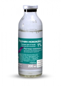 Опис Стерильний прозорий безбарвний розчин. Склад 100 мл препарату містять діючу речовину: новокаїн - 1 г. Фармакологічні властивості Новокаїн володіє місцевоанестезуючою дією, зменшує утворення ацетилхоліну та знижує збудливість периферичних холінреактивних систем; блокує вегетативні ганглії, зменшує судоми гладких м'язів, знижує збудливість серцевого м'язу, моторних ділянок кори головного мозку. Новокаїн малотоксичний для тварин. Застосування 1% розчин новокаїну застосовують для провідникової та епідуральної анестезії, а також для внутрішньоаортального введення. Дозування Дози та кратність введення залежать від маси тіла тварини та перебігу хвороби. Максимальні разові дози на одну тварину: коні - 200- 250 мл; велика рогата худоба - 150-200 мл; собаки - 30-50 мл. Перед використанням розчин новокаїну слід підігріти до температури тіла тварини. Протипоказання Індивідуальна підвищена чутливість до новокаїну, гіпотензія, гнійні процеси в місці введення. Застереження Не перевищувати максимальних доз! Внутрішньовенне введення препарату у максимальних дозах викликає збудження. Форма випуску Скляні флакони з гумовими корками та алюмінієвими ковпачками під обкатку по 100 мл. Зберігання Сухе, темне, недоступне для дітей місце при температурі від 5°С до +25°С. Термін придатності - 3 роки з дати виготовлення. Для ветеринарного застосування!