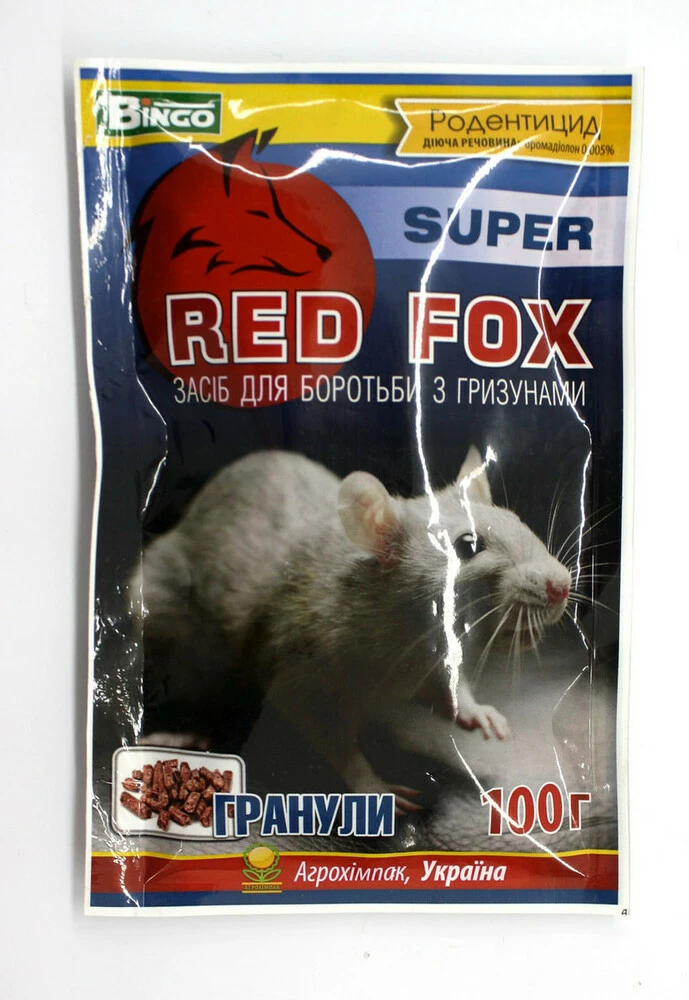 Red Fox - засіб для боротьби з сірими і чорними пацюками, будинковими мишами, полівками та іншими мишоподібними і хом'як якоподібними гризунами у середовищі життєдіяльності людини. Призначений для повного знищення популяцій гризунів та для профілактики їх появи.