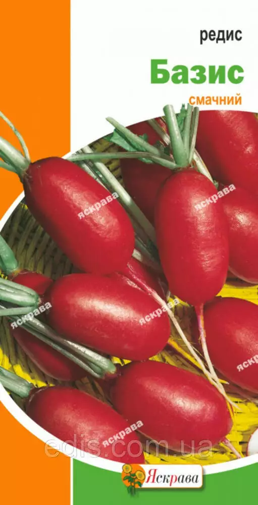 Редис Базис 3 рРанньостиглий сорт, період від посіву до збору 23-25 днів. Коренеплід рожево-червоний з білим кінчиком, овально-округлий, вагою 14-25 р, гладкий. Коренеплід на 2/3 занурений у землю, легко висмикується .Чудові смакові якості. Цінується за дружне формування врожаю, стійкість до захворювань (бактеріальна гниль, чорна ніжка). Рекомендується для вирощування у відкритому гунте. Редиску висівають ранньою весною, починаючи з середини квітня, кілька разів з інтервалом в 10-12 днів, річний посів проводять в кінці липня-початку серпня для споживання восени. Холодостійка культура, молоді рослини переносять заморозки до -2-3 С. Оптимальна температура для росту 18-20 С. Кращими попередниками є культури, під які вносять органічні добрива. Щоб коренеплоди були красивої форми і не стрелковались уникайте загущеності посівів, тривалої сухості землі і дії низьких температур.