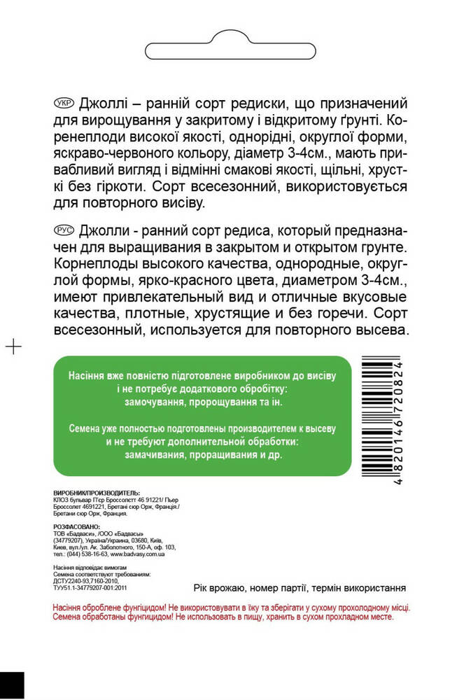 Ранній сорт редиски, що призначений для вирощування у закритому і відкритому ґрунті. Коренеплоди високої якості, однорідні, округлої форми, яскраво-червоного кольору, діаметр 3-4см., мають привабливий вигляд і відмінні смакові якості, щільні, хрусткі без гіркоти. Сорт всесезонний, використовується для повторного висіву.