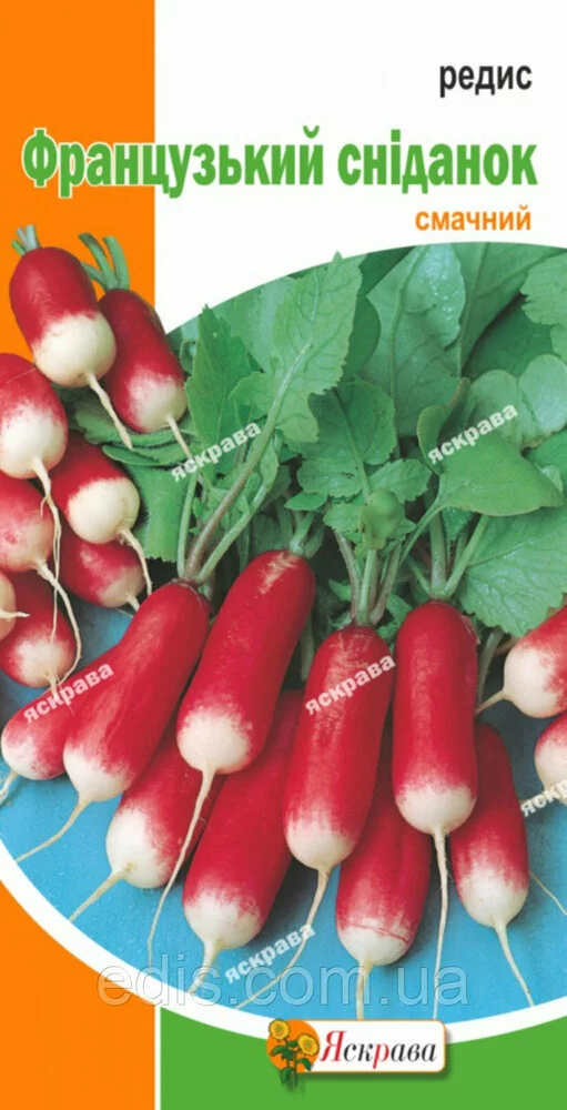 Редиска Французький сніданок 3 рРанньостиглий сорт, 23 дні. Листова розетка невелика. Коренеплід циліндричної форми, яскраво-червоного кольору з білим кінчиком, довжиною до 6 см і діаметром до 2 см. М'якоть біла, ніжна і смачна. Довго зберігає свої споживчі властивості. Ціниться за вміст хімічних сполук і ферментів, які покращують обмін речовин і травлення їжі в організмі. Призначений для вирощування в полі, а також навесні в теплицях і парниках.