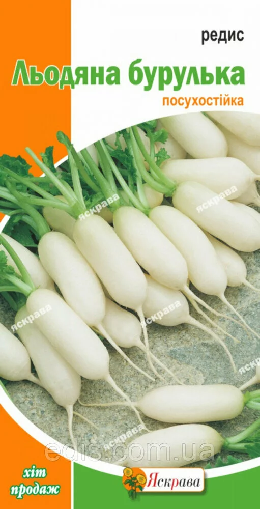 Редис Крижана бурулька 3 рСередньостиглий сорт посухостійкий, стійкий до стрілкування. Вегетаційний період - 27-35 днів. Коренеплід білий, масою 18-28 р подовженої форми, заглиблений у грунт на 3/4-4/5 довжини. М'якоть біла, соковита, хрустка, на смак - середньо-гострий.