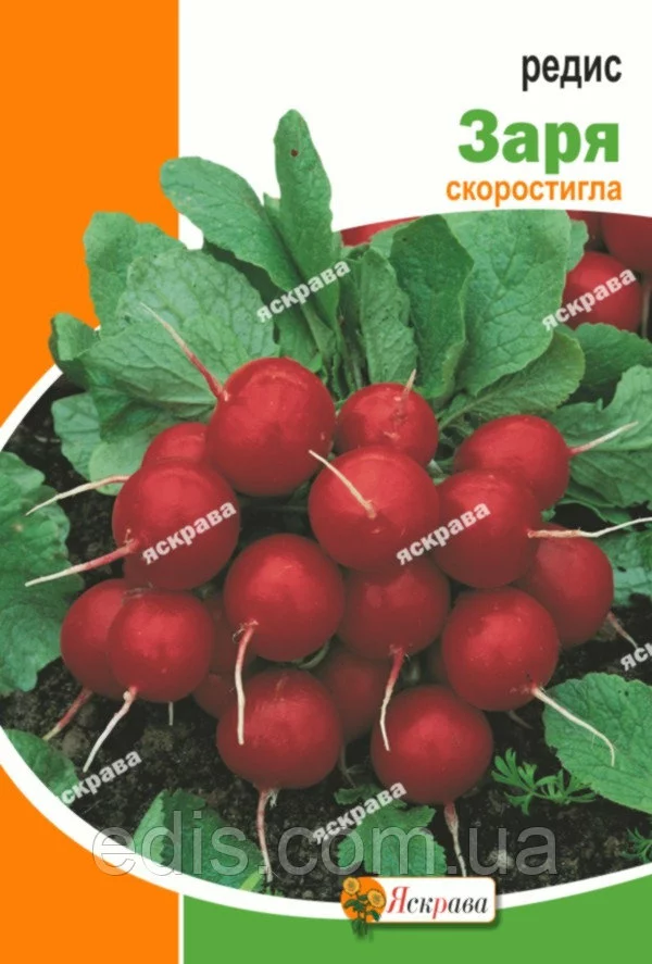 Редис Зоря 10 гСкоростиглий сорт. Вегетаційний період від сходів до технічної стиглості 22-25 днів. Коренеплід овальний, темно-червоного забарвлення, масою 18-25 г, повністю заглиблений в гунт. М'якуш білий, соковитий, без гіркоти. Товарна врожайність у відкритому гунте 2 кг/кв. м, в захищеному 3 кг/кв. м. Рекомендується для вирощування у відкритому гунте і плівкових наметах.