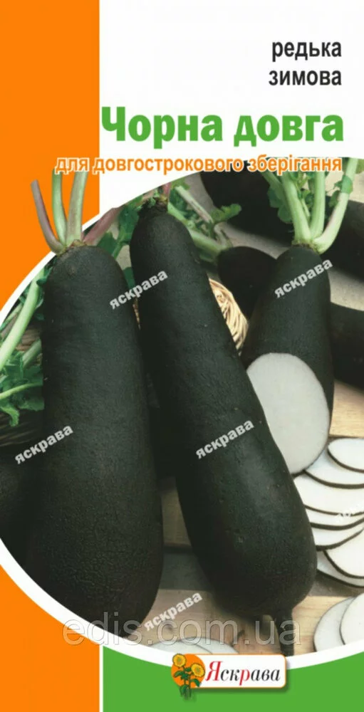 Редька Чорна довга (зимова) 2 гНовий середньостиглий сорт. Період вегетації 90-100 днів. Коренеплоди великі, масою 250-400 г, циліндричної форми. Забарвлення шкірки чорного кольору. М'якоть біла, щільна і соковита, хороших смакових якостей. Для літнього споживання редьку висаджують ранньою весною, для зимового зберігання - в першій декаді липня. Використовується для споживання у свіжому вигляді і тривалого зимового зберігання.