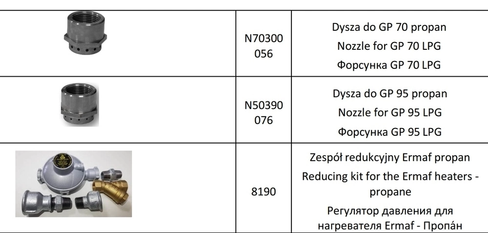 Вы можете выбрать и заказать online запчасти к котельному и горелочному оборудованию ERMAF: Регулятор давления GP газ LPG  нагревателей Ermaf  code 8190 / артикул по каталогу N 8190   доступен для заказа через Корзину .