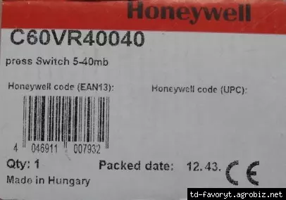 Технические характеристики реле давления Honeywell C60VR40040