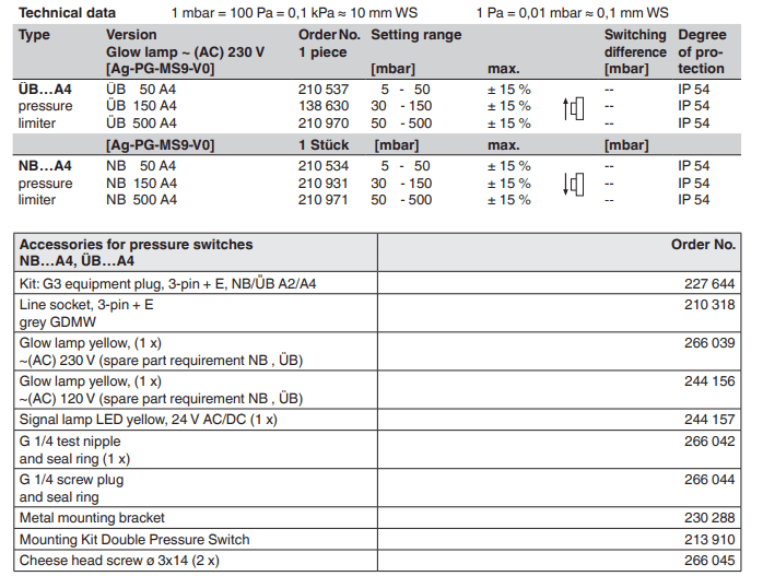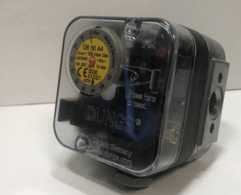Реле тиску Dungs UB 50 A4 артикул 210537 застосовується як обмежувач максимального тиску в топкових агрегатах, де будь-яке перевищення тиску критично. Прилад легко налаштовується, має надійне вироблення й компактний корпус. Підходить для обладнання пальників більшості брендів. Відповідають нормативу EN 1854.