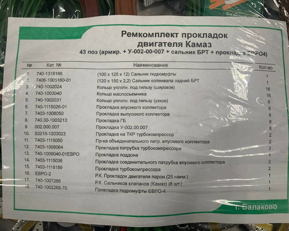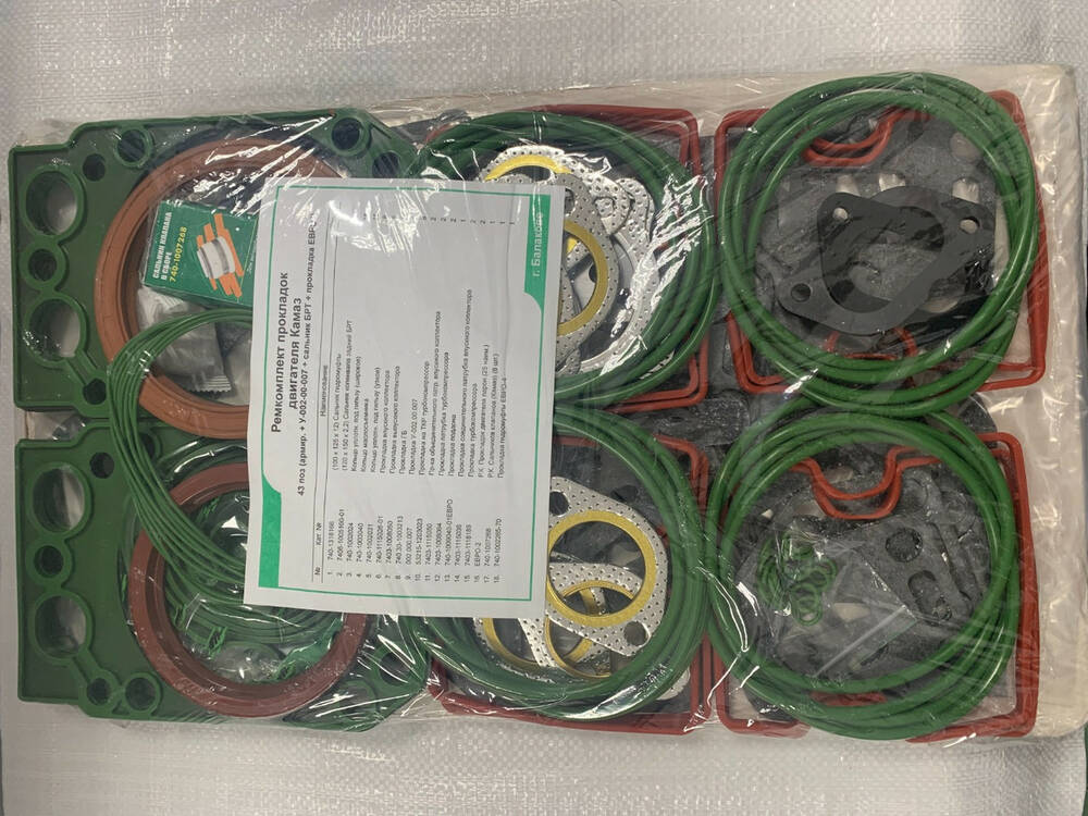 Ремкомплект (Рк) прокладок двигателя 43 поз. (зелен. армир.+У-002-00-007+сальник БРТ+прокладка ЕВРО4) для