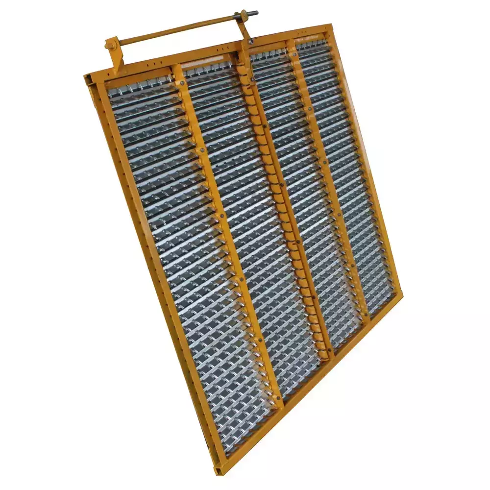 Решето верхнє 54-2-12-3В НВР (Евроваріант, технологія John Deere, Жовті) являє собою зварений, квадратний каркас з квадратної труби з встановленими на ньому жалюзями з штампованого металу товщиною 0,8 мм. При цьому жалюзі виконані спеціальним штампом, в якому задній вусик має таку форму, і так відігнуть, як на імпортних комбайнах, що дозволяє охолоджувати зерно максимально ефективно. Встановлюється це решето в системі очищення зерна, відразу після стрясной дошки і називається верхнім бо розташоване вище нижнього решета. Служить для просіювання зернової маси, все що проходить крізь жалюзі потрапляє на нижню решето. Останні роки все аграрії йдуть від використання решіт з класичної гребінкою і переходять на евроваріант. За такою ж технологією виконані решета всіх відомих світових лідерів John Deere, Claas і ін. Відрізняється від нижнього розмірами і функцією регулювання нахилу жалюзі. В даному випадку розглядаються верхні решета жовтого кольору, це продукція українського виробництва і деякий час назад вона відрізнялася від чорних в гіршу сторону. Був недостатньо якісний штамп для виробництва жалюзі, і вони не давали тій мірі кавітації, яка потрібна. На даний момент штамп виправлений і решета повністю виконують свою функцію. Рекомендуємо не змінювати окремо або верхнє, або нижнє, а міняти комплектом. Ви можете купити ці решета комплектом: верхнє + нижнє + подовжувач верхнього решета. На комбайні встановлюється в кількості 1 шт.