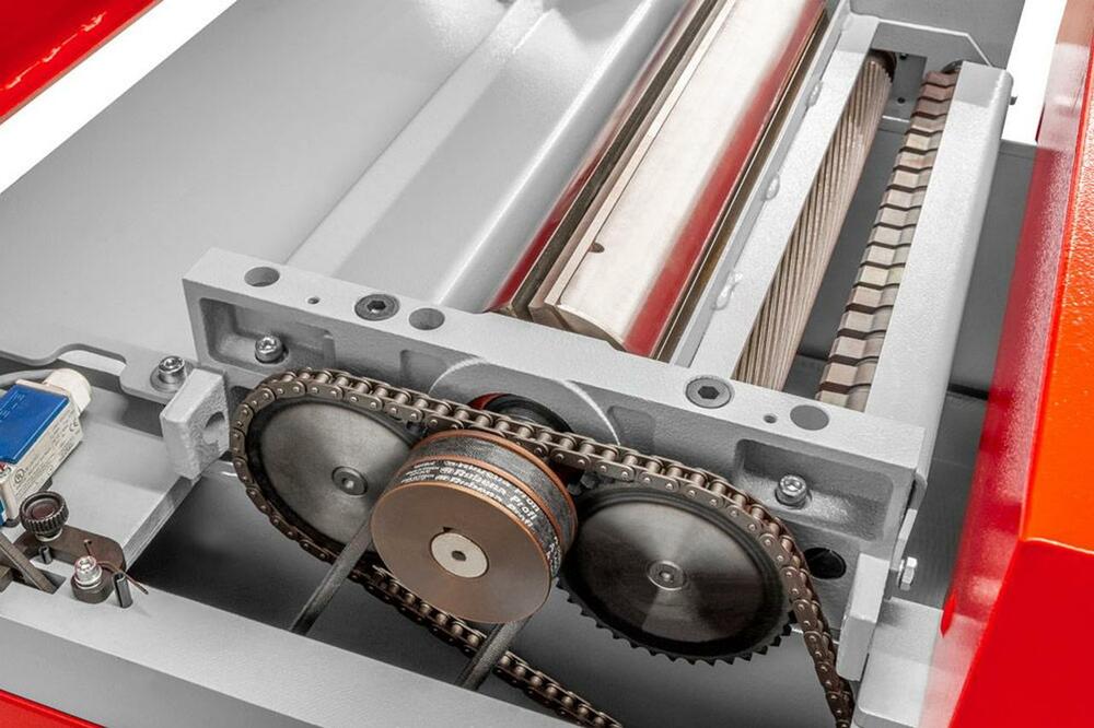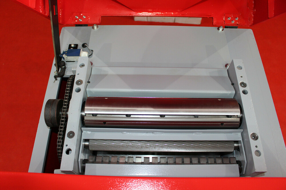Чугунный шлифованный рейсмусовый стол с двумя протяжными роликами обеспечивает легкое скольжение заготовки