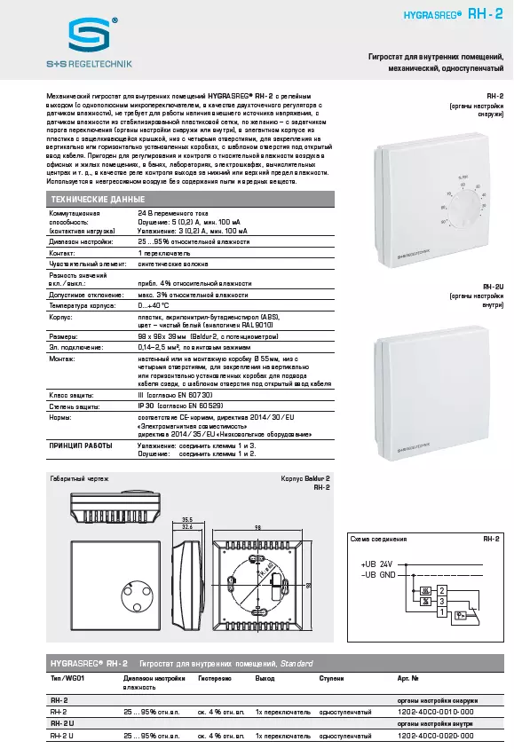 Механічний гігростат для внутрішніх приміщень HYGRASREG® RH — 2 з релейним виходом (з однополюсним мікроперемикачем, як двоточковий регулятор із датчиком вологості), не вимагає для роботи наявності зовнішнього джерела напруги, з датчиком вологості зі стабілізованої пластикової сітки, (органи настроювання зовні або всередині), в елегантному корпусі з пластику з кришкою, що застібається, низ із чотирма отворами, для закріплення на вертикально або горизонтально встановлених коробках, з шаблоном отвору під відкрите введення кабелю. Придатний для регулювання й контролю за низькою вологістю повітря в офісних і житлових приміщеннях, у лазнях, лабораторіях, електрошатах, обчислювальних центрах тощо, як реле контроль виходу за нижню або верхню межу вологості. Використовується в неагресивному повітрі без вмісту пилу та шкідливих речовин