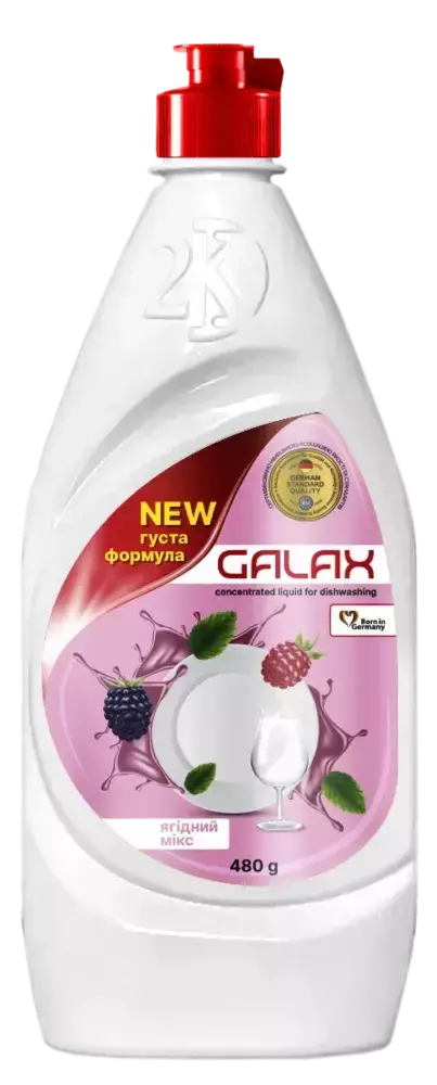 Рідина для ручного миття посуду Galax Ягідний мікс дуже економічно використовується, тому на губку її потрібно наносити досить мало. Усе це завдяки густій консистенції та прекрасним чистильним властивостям, які зберігаються навіть під час миття посуду в холодній воді. Засіб легко піниться та проникає у структуру жиру, прекрасно позбавляє від нього, має приємний запах, дарує ніжність вашим рукам. Крім того, його можна використовувати не тільки для миття посуду, а й для очищення інших пластикових, скляних, металевих та керамічних поверхонь. Рідина легко змивається водою, не залишаючи розводів.