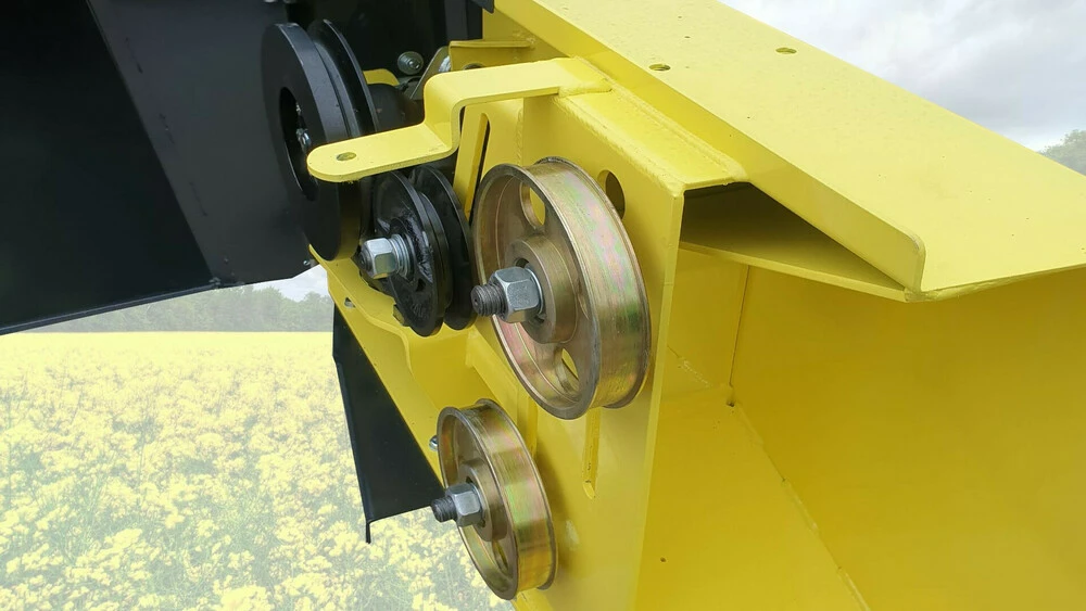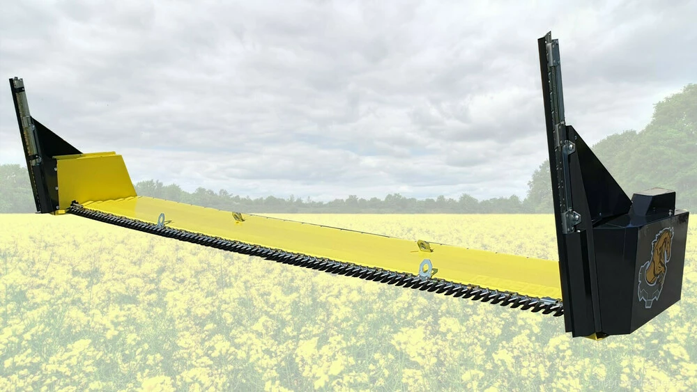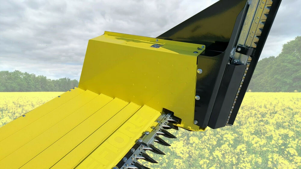 • Бічний дільник ріпакового столу складається з двох активних ножів, а не одного. Подвійний сегмент на бічному дільнику в парі з двома активними ножами забезпечує якісний зріз рослини за рахунок підвищеної частоти зрізу. Така конструкція дозволяє усунути розгойдування пристосування і зменшити вібрацію. Тепер немає необхідності встановлювати на ріпаковий стіл дорогого електричного або гідравлічного активного дільника, оскільки швидкості зрізу бічних ножів вистачає із запасом, незалежно від стану рослини.