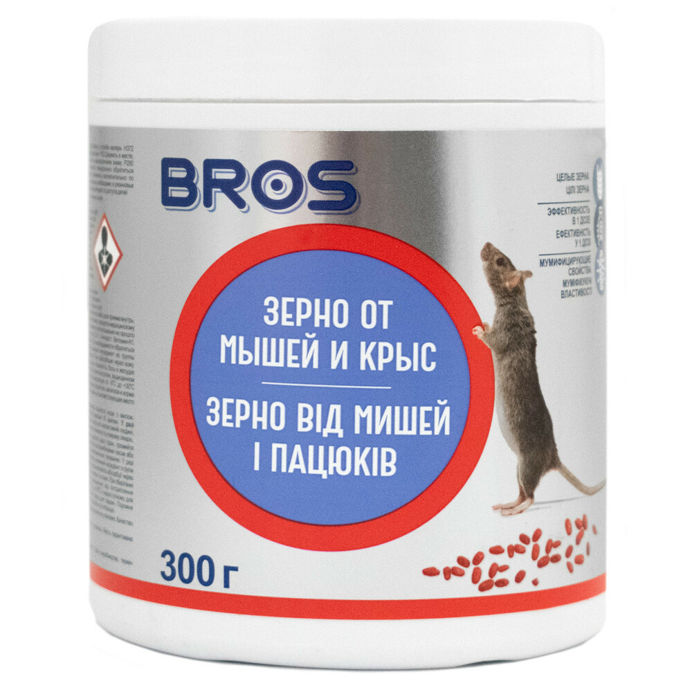 Зерно від мишей і щурів Bros є універсальним високоефективним препаратом швидкої дії для знищення мишей і щурів в різних приміщеннях, як в житлових, так і в промислових. Препарат - це відібрані зерна, оброблені бромаділіоном, що має привабливий запах і смак. Зерно Bros у своєму складі має спеціальну речовину, яка не допускає випадкового проковтування отрути домашніми вихованцями і людиною. При використанні препарату необхідно дотримуватися запобіжних заходів.