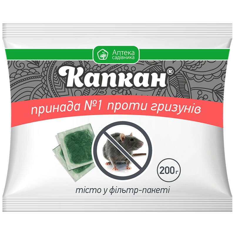 Капкан тістоподібна принада- готова принада у вигляді отруйної суміші насіння культурних рослин для знищення мишовидних гризунів у житлових, промислових та нежилих приміщеннях, а також на сільскогосподарських угіддях та на присадибних ділянках.
