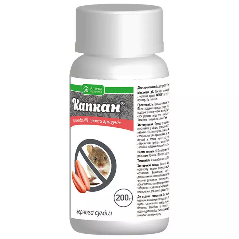 Капкан зернова принада - готова принада у вигляді отруйної суміші насіння культурних рослин для знищення мишовидних гризунів у житлових, промислових та нежилих приміщеннях, а також на сільскогосподарських угіддях та на присадибних ділянках.
