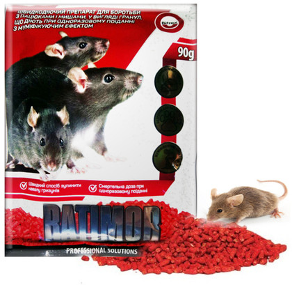 Родентицид «Ратімор» є гранульованою приманкою, яка вже готова до використання. Вона ефективна для боротьби з мишами та щурами на різних ділянках. У складі даного препарату міститься бромадіолон, феромон та муміфікатор.