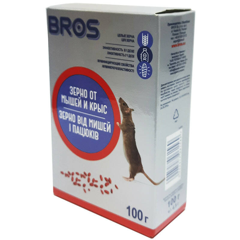 Зерно Bros від мишей і пацюків представляє собою готову приманку з ретельно відібраними зернами злаків, для знищення мишей і щурів в житлових приміщеннях, складах, підвалах. Має бальзамуючі властивості і містить гіркий компонент, який захищає людей і тварин від випадкового вживання.
