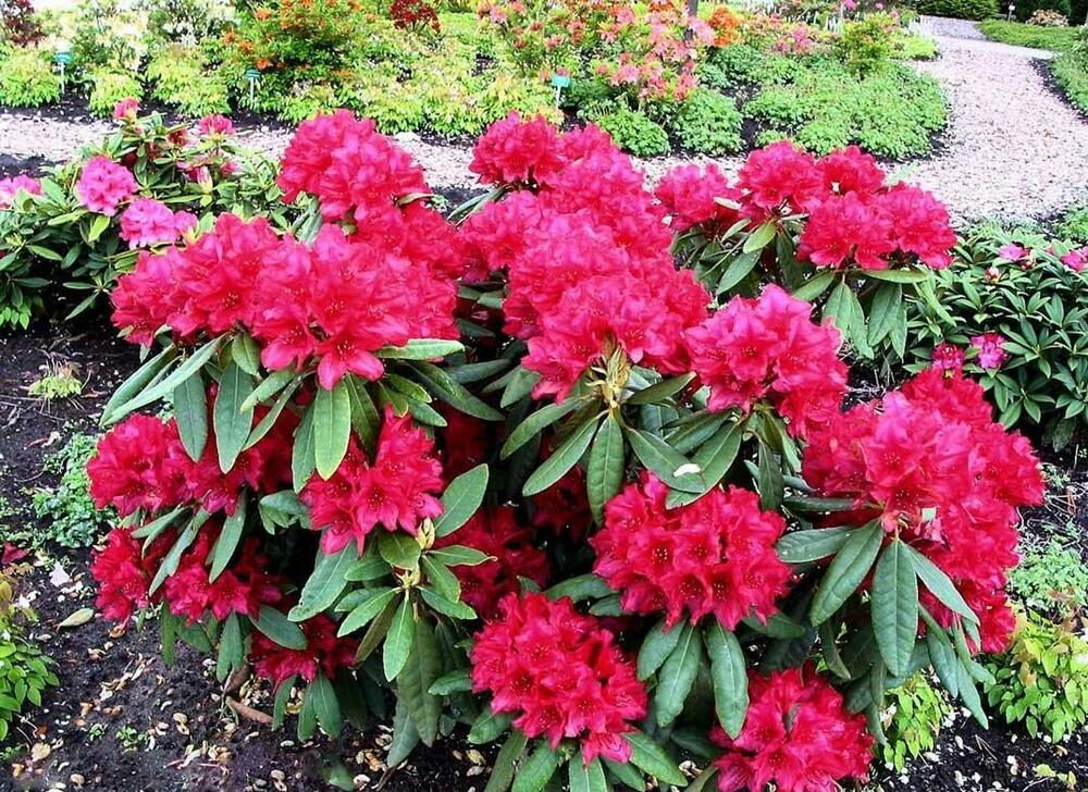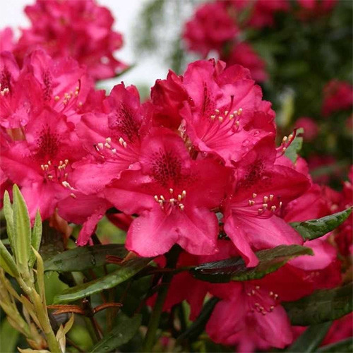 Опис: Рододендрон гібридний Нова Зембла - вічнозелений рясно квітучий чагарник, унікальний темно-зеленим листям, що створює фон для інших рослин, а в літній період захоплює погляди пишністю рубіново-червоних квітів з фіолетово-коричневим вкрапленням з золотистими пильовиками. Ця рослина стане прикрасою вашої домашньої колекції декоративних рослин.