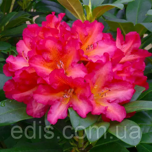 Персиково-рожеві пелюстки з вишневим крапом в середині і по краю неоново-рожеві. Темно-зелене листя рододендрона зберігається на пагонах навіть узимку.