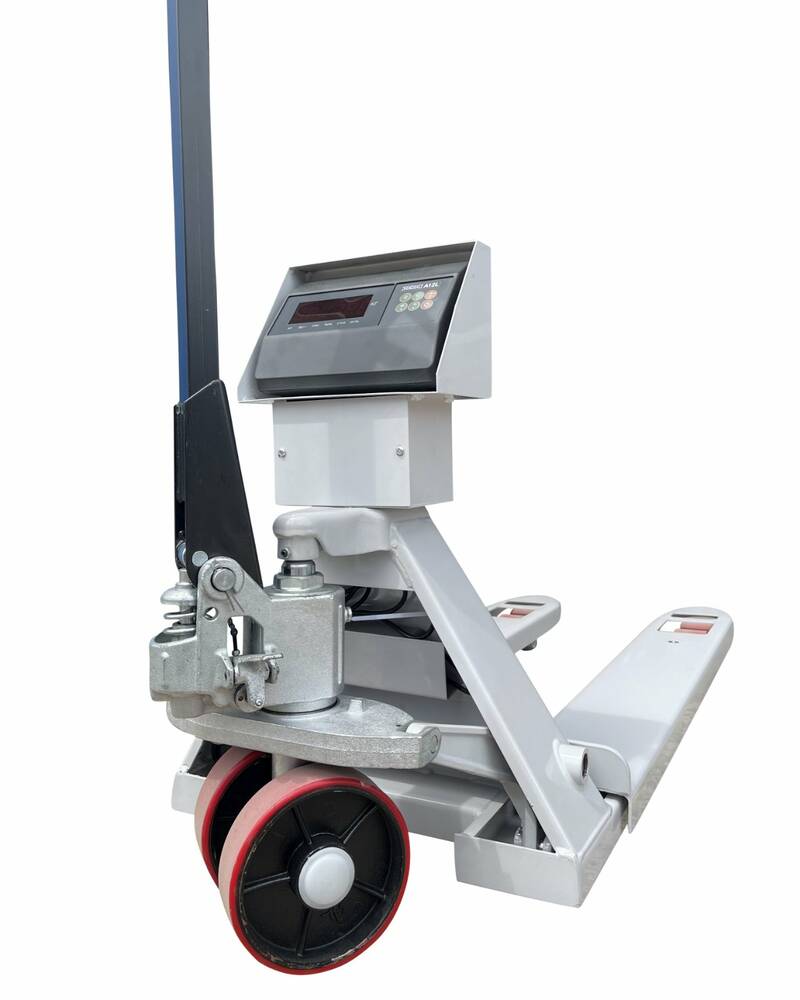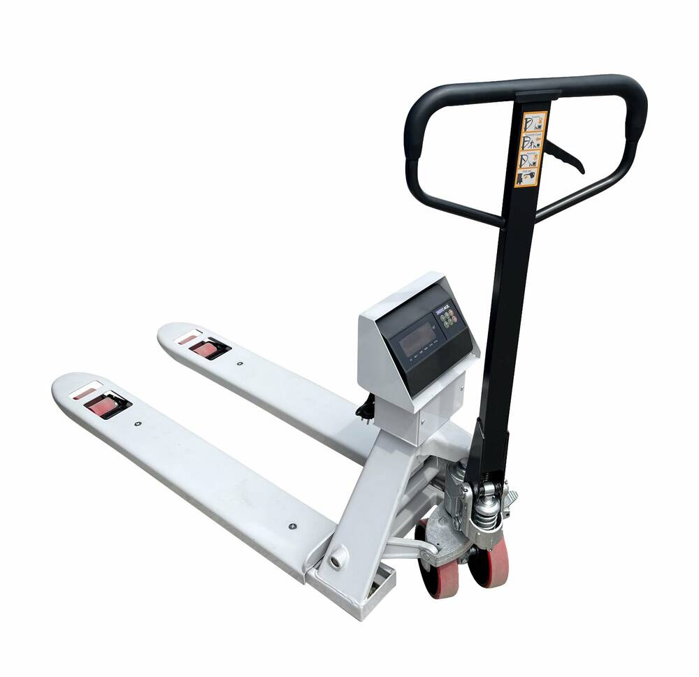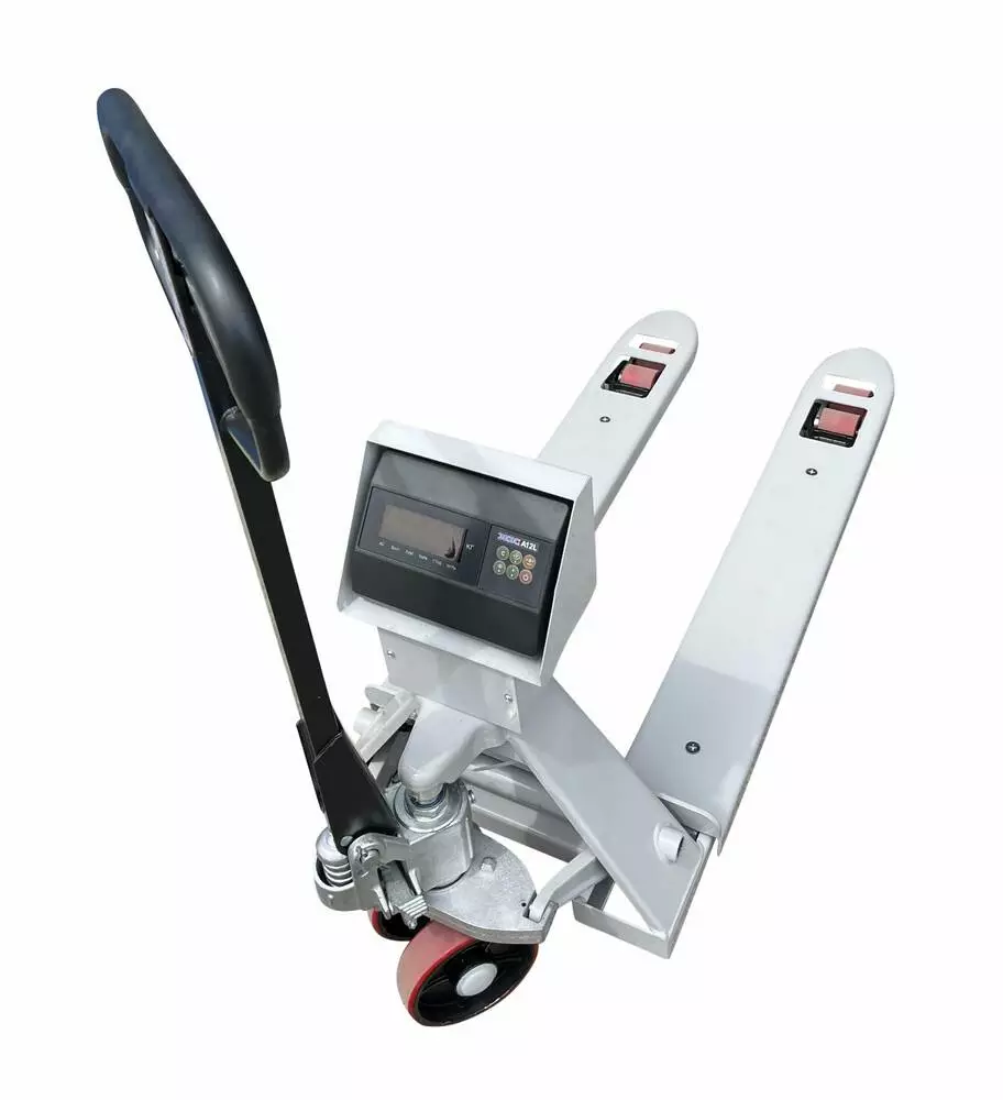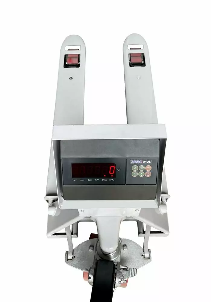 Весовой индикатор комплектуется аккумулятором, полиуретановые колеса и гладкая поверхность вил на рокле.