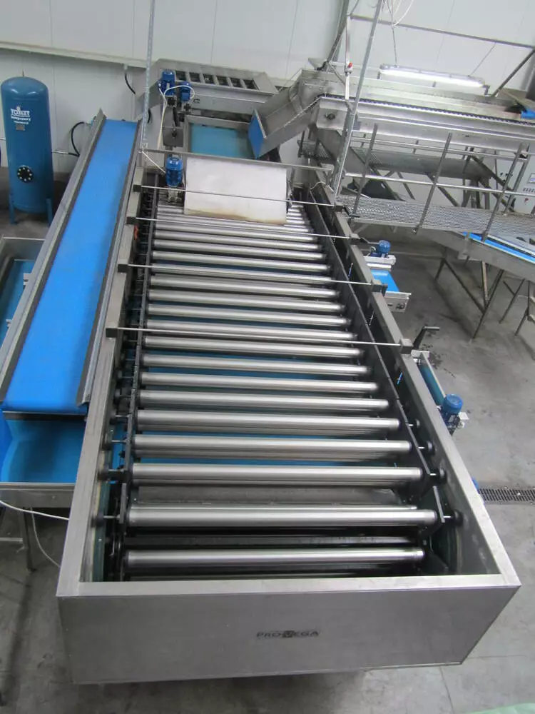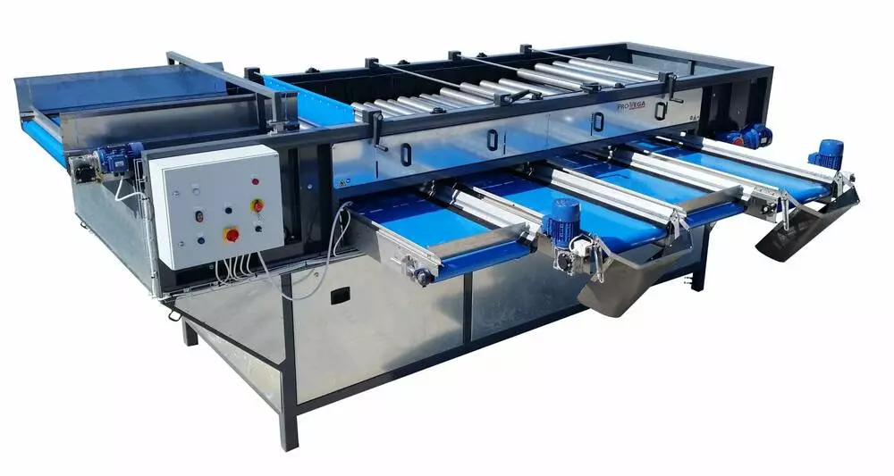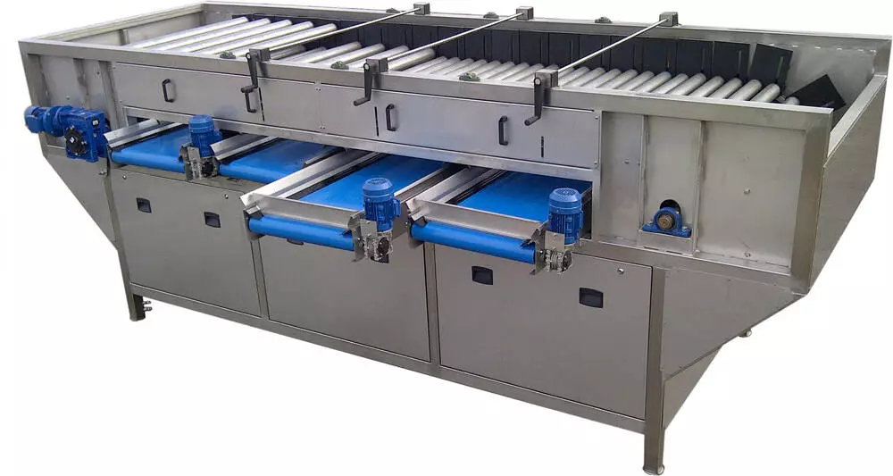 Відстань між валами регулюється вручну системою рукояток (регулювання з двох сторін верстата). Відсортовані овочі потрапляють на транспортери, які переміщають продукт в контейнери або до наступного обладнання в лінії.