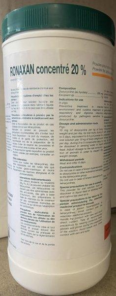 РОНАКСАН 20% спочатку потрібно розвести, щоб отримати 1% премікс, що містить 200 гр доксицикліну в 20 кг преміксу. Потім 20-30 кг 1% преміксу змішують з 1 000 кг кінцевого корму, так щоб вийшло 200-300 мг активного інгредієнта (1 кг Ронаксану 20% в 1 тонні готового корму).