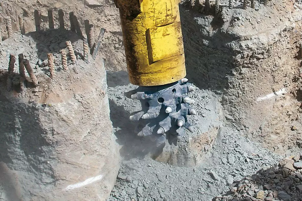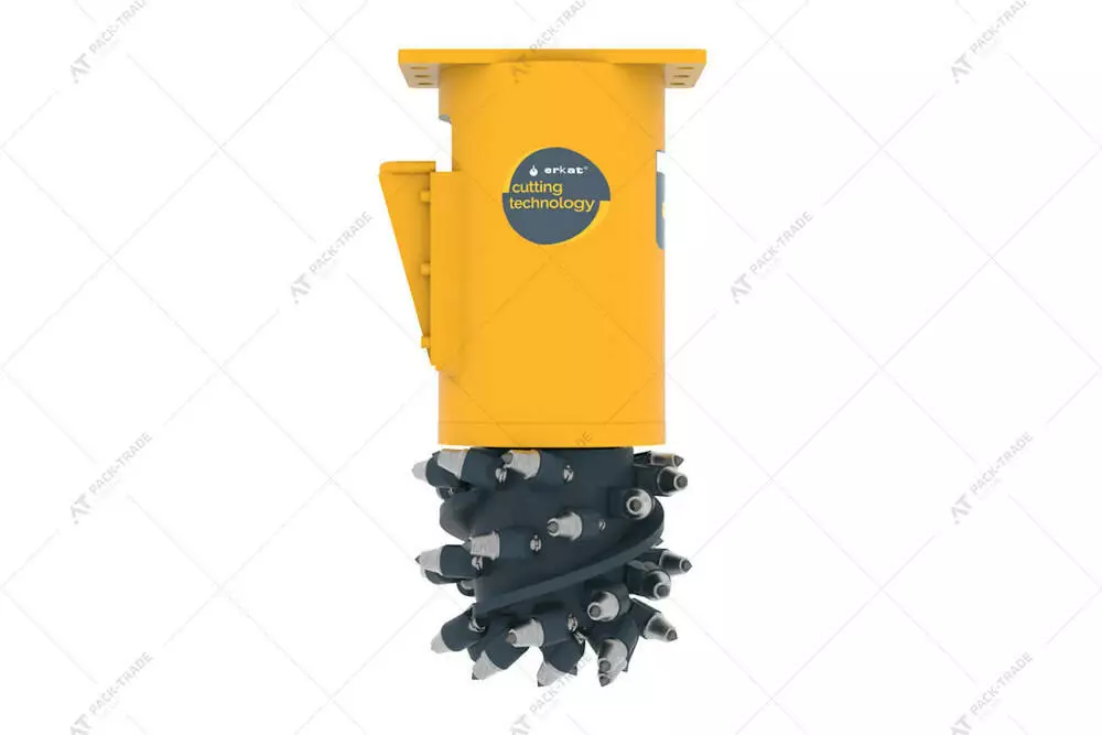 Роторна барабанна фреза Epiroc ER100L на екскаватор. Вага машини-носія — 3-7 т. Роторні фрези поздовжньої конструкції серії ER-L призначені для розроблення вузьких траншей, демонтажу оголовків паль і очищення канав.