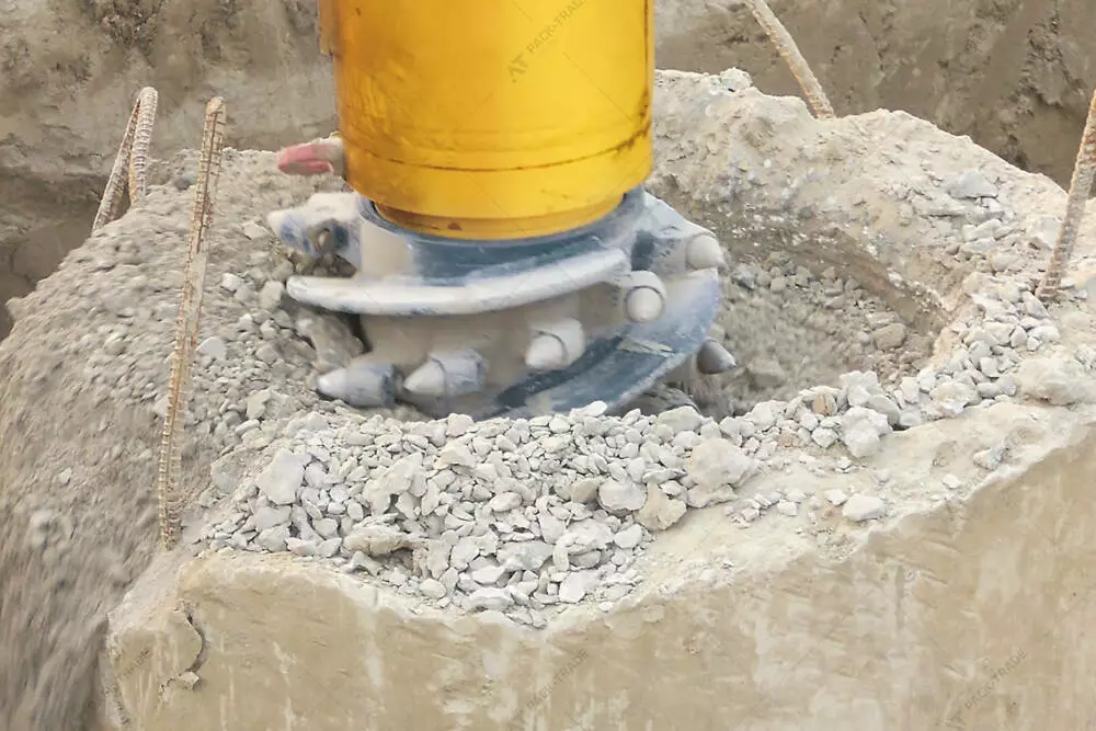 Роторна барабанна фреза Epiroc ER400L на екскаватор. Вага машини-носія — 12-17 т. Роторні фрези поздовжньої конструкції серії ER-L призначені для розроблення вузьких траншей, демонтажу оголовків паль і очищення канав.