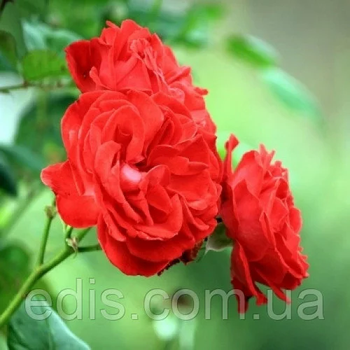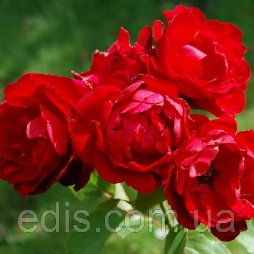 Суцвіття з декількох великих квіток, насичено червоного кольору, махрових, до 10 см в розпуск.