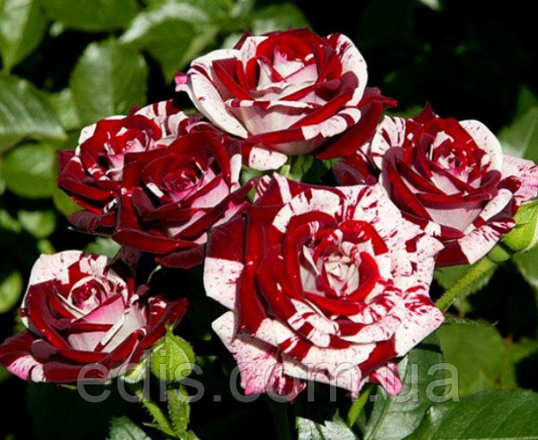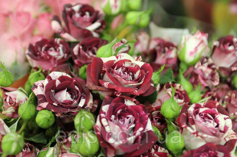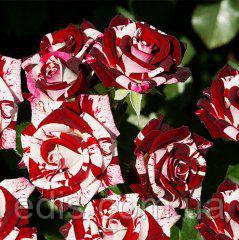 Роза спрей Найт Флеш ( Flash Night ) Рясно квітуча великими кистями двоколірна спрей троянда. Червоні квітки з білими смугами і штрихами. Квітки середні, напів-розпуск - класичної бокалоподібної форми, в повному розпуск більш плоскі, пелюстки (17-25 штук) відгинаються трикутником на зовнішню сторону. Цвіте протягом усього сезону.