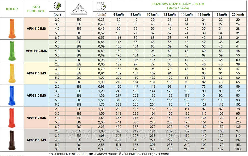 Він виробляє товсті краплі з високою стійкістю до дрейфу, що дозволяє обприскувати в несприятливих умовах (вітер до 8 м / с, низька вологість повітря, більш висока температура).