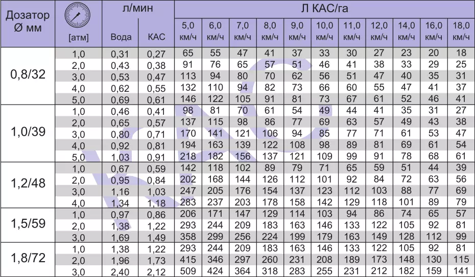 У комплекті до розпилювача йде дозуюча шайба на будь-яку норму внесення 0,8; 1,0; 1,2; 1,5; 1,8; 2,0; 2,5 і гумова прокладка (норму внесення можна подивитися на фото нижче)