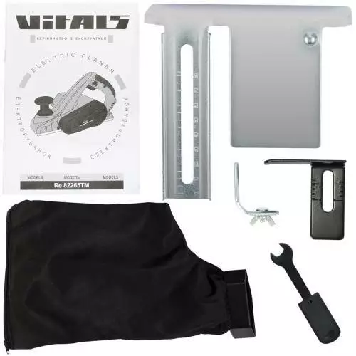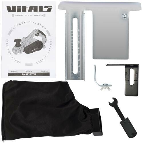 Корпус і рукоятки електричного рубанка Vitals Master Re 82265TM виготовлені з високоякісного ударостійкого пластику. Передня рукоятка одночасно є регулятором глибини стругання. Всього передбачено 11 рівнів установки глибини, максимальна глибина стругання становить 2 мм. Ширина ножів - 82 мм. Задня рукоятка з м'якою антифрикционной накладкою забезпечує надійний хват і повне управління приладом при виконанні ним усіх технологічних операцій.
