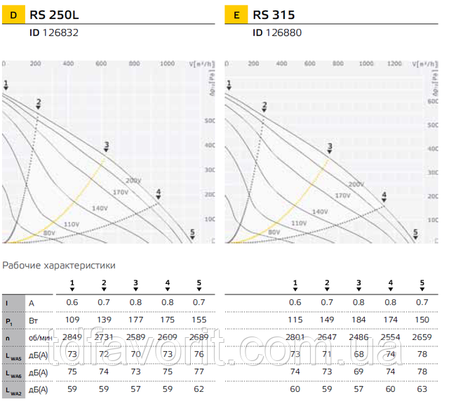 Характеристики круглых канальных вентиляторов RS