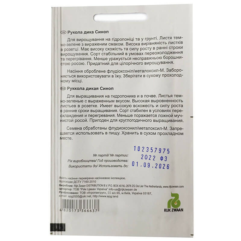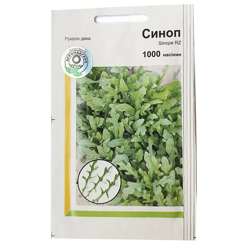 Рукола Сіноп - це ранній швидкозростаючий сорт руколи, вегетаційний період якого складає всього 15-25 діб. Призначений для обробітку в ґрунті та на гідропоніці. Сорт формує тонке, слаборозсічене листя темно-зеленого забарвлення з пікантним горіхово-гірчичним смаком. Листя рекомендовані для вживання у свіжому вигляді як гарнір до м'ясних та рибних страв, можуть використовуватися для приготування салатів та бутербродів. Зелень також підходить для зберігання та деяких видів переробки.