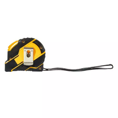 Корпус рулетки виготовлений із міцного пластику з прогумованими вставками, що забезпечує надійний захист від ударів та комфортне утримання. Чітке контрастне маркування на металевій стрічці дозволяє легко зчитувати значення, а зручний механізм змотування забезпечує плавне та безпечне втягування полотна.