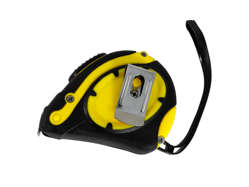 Корпус рулетки виконаний із ударостійкого пластику, що забезпечує довговічність та захист від механічних пошкоджень. Прогумовані вставки покращують зчеплення з рукою, запобігаючи вислизанню під час роботи.