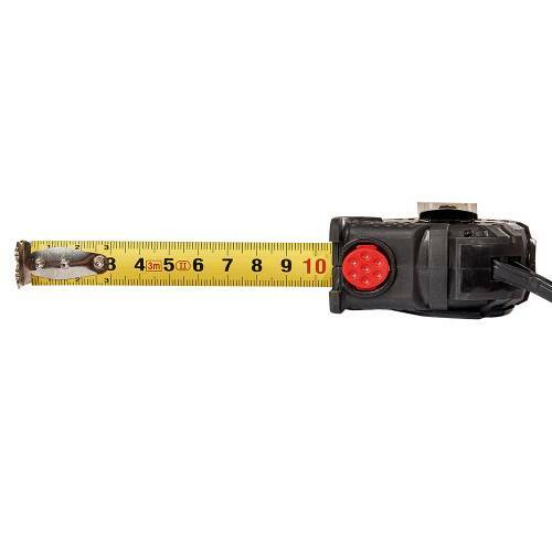 - **Двосторонній зачіп з магнітом**: Забезпечує більш точні виміри та однакову зручність використання обох сторін розмітки. Магнітний зачіп на стрічці забезпечує надійне зчеплення з металом під час вимірювань.