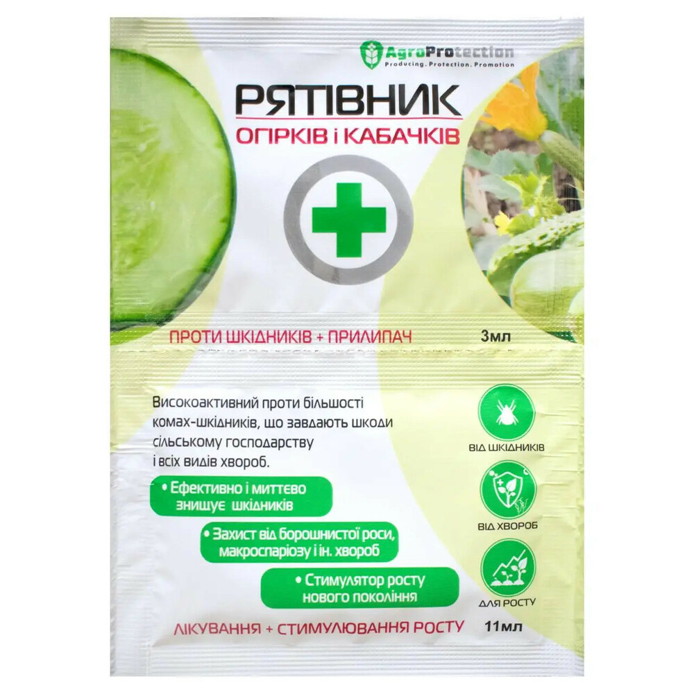 Четырехкомпонентный препарат, що використовується для обробки посівів огірків і кабачків з метою знищення і захисту від широкого спектру хвороб та комах шкідників. Рятувальник огірків відмінно зарекомендував себе в боротьбі з такими хворобами, як ридоктониоз, фітофтороз, септоріоз, оїдіум, мілдью, альтернаріоз, плямистості, антракноз, іржа, хлороз, борошниста роса, бактеріоз, моніліоз, фомоз, альтернаріоз, переноспорозу, парша, макроспоріоз, фузаріоз, ринхосоприоз, гнилі, цвілі, кучерявість, молочниця, так само даний засіб відмінно справляється з такими паразитами колорадський жук, попелиці, тріпс, совка, квіткоїд, довгоносик, плодожерка, пипильщик, міль, листовійка, муха, блішки, білокрилка, кліщ, клоп, щитівка, цикадка, стеклянница, мертвоед, червець, метелик. Препарат має тривалий період захисної дії до трьох тижнів, миттєво впливає на шкідників і знищує їх вже через 24 години після обробки. До складу препарат також входить висококонцентроване добриво, яке володіє антистресовим ефектом та покращує якість урожаю.
