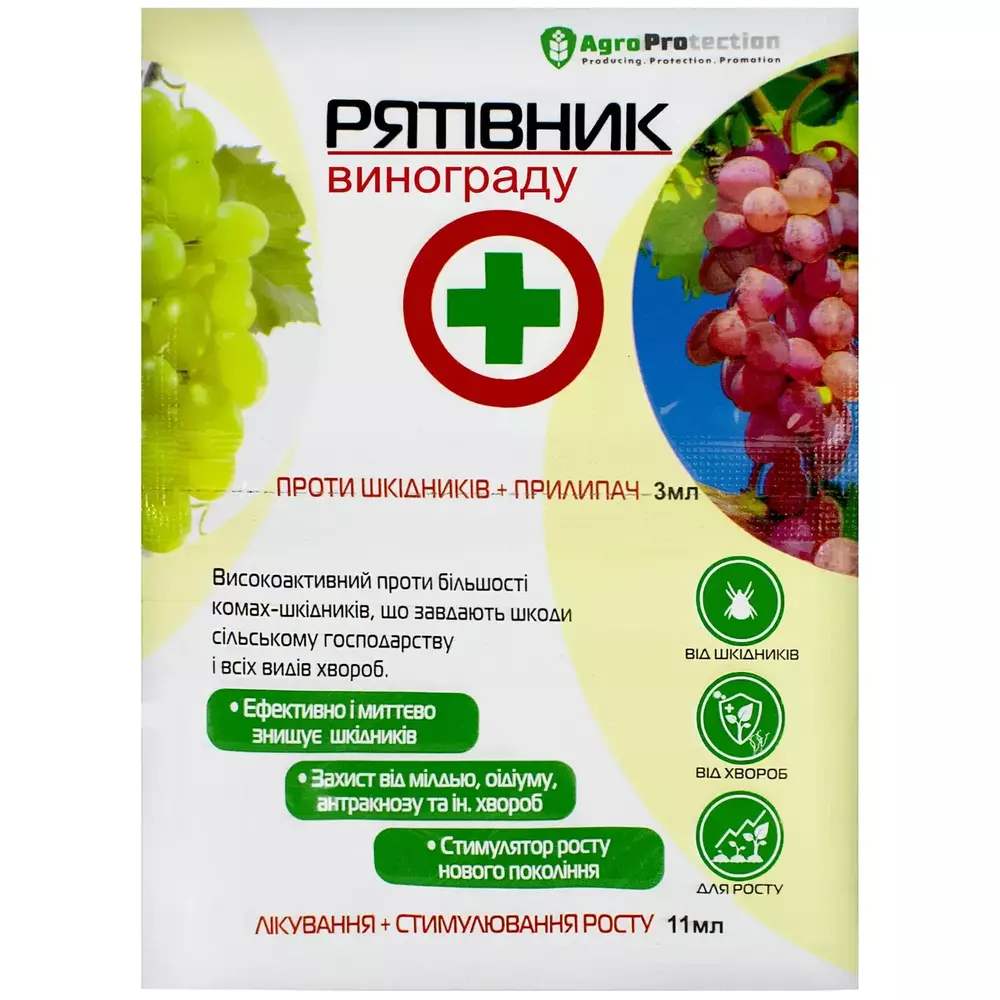 Чотирикомпонентний комплексний препарат для захисту винограду Рятівник у комплекті з прилипачем застосовується проти більшості шкідників і всіх різновидів патогенних захворювань цієї культури. До складу засобу входить інсектицид Protect Duo/Протект Дуо, що містить активні речовини: тіаклоприд — 200 г/л і клоріанідин — 100 г/л, а також фосфорно-калійне добриво Квантум (Р2О5-25%, К2О-25%, фосфор у формі фосфіту), стимулятори росту та амінокислоти. Рятувальник має фунгіцидний ефект, виражений профілактичною та лікувальною дією проти більшості патогенів. ПАР засобу Рятівник підвищує ефективність і тривалість його дії. Завдяки наявності поверхнево-активних речовин (ПАВ), підвищується змочування поверхні листя, що сприяє кращому проникненню активних речовин у рослину. Як наслідок, зменшує витрату робочого розчину препарату. ЗАЗР Рятувальник ефективно застосовується для захисту винограду від комах шкідників: ти, філоксери (листової форми), довгоносика, павутиного кліща, листогризучих гусениць, листожерток, трипсів та інших шкідників, а також від патогенних захворювань: мілду (несправжній борошнистій роси), оїдіуму, танкноза, сірої гнилі, плямистого некрозу, бактеріального раку, вірусної мозаїки та інших хвороб.