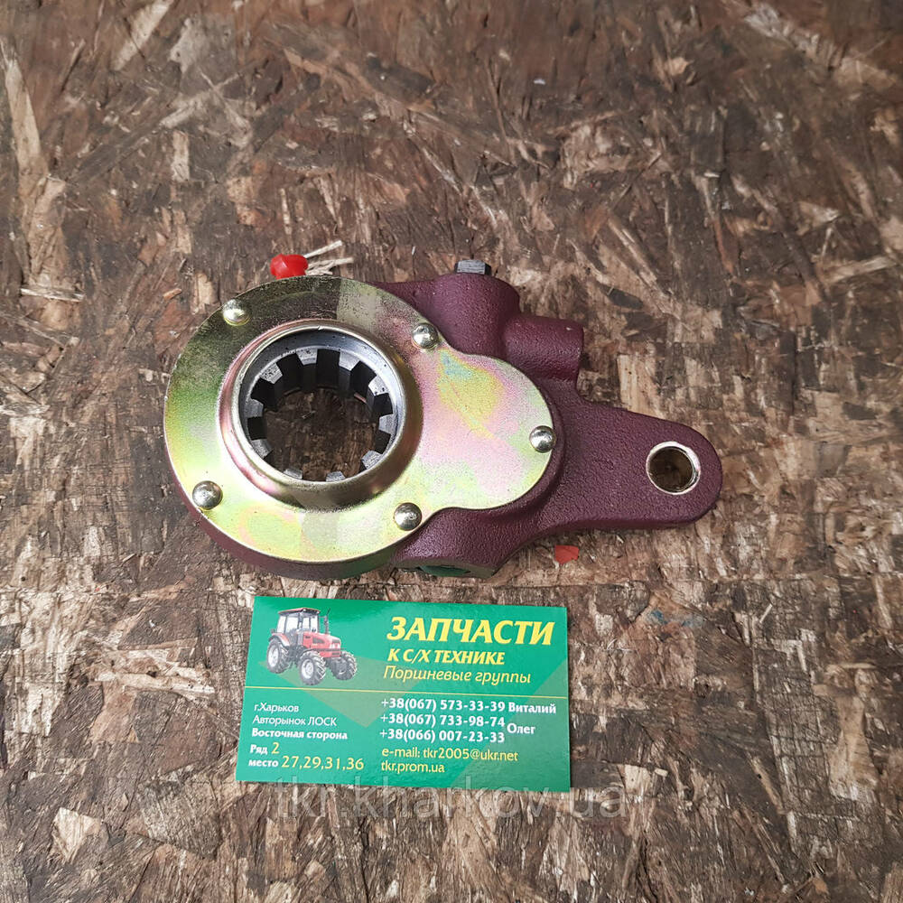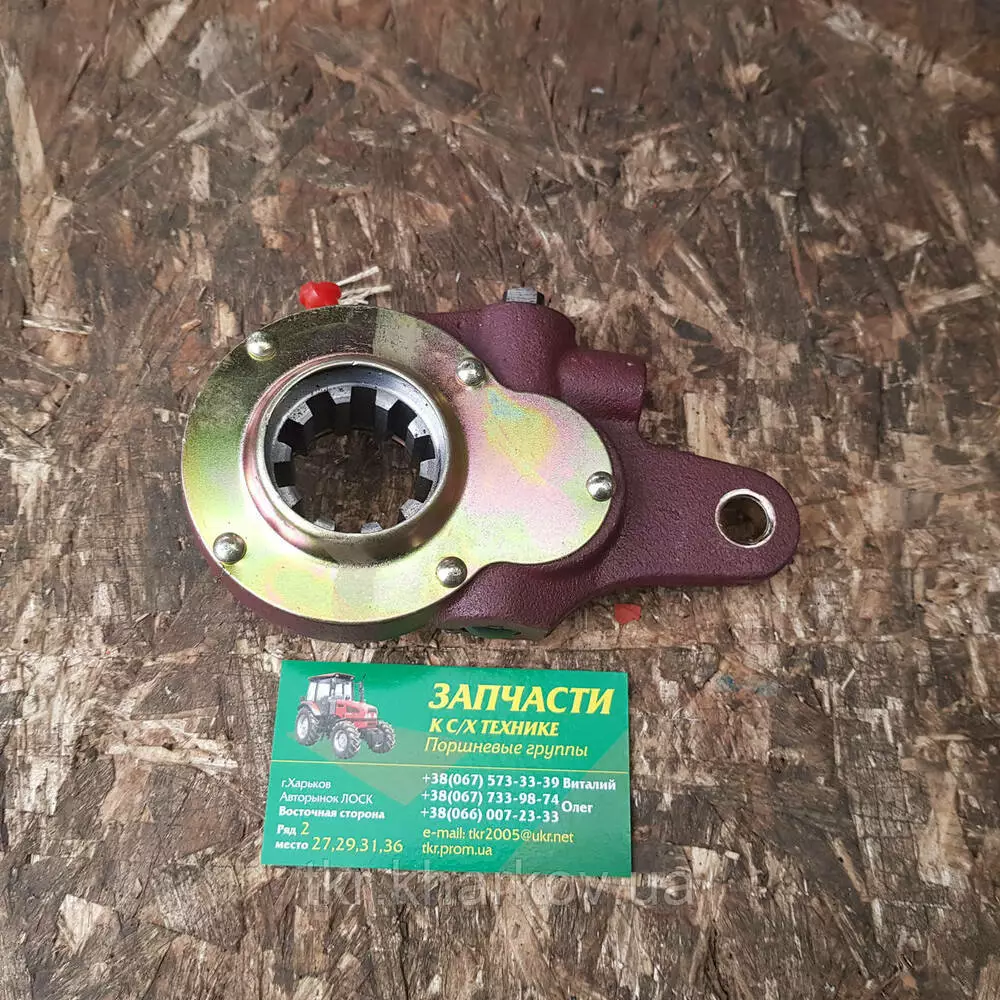Важіль регулювальний 120-3501136 у зборі, тріскачка, що веде тракторний моста колісних — , Х Т Т Т, Т-151, Т-156, Т-17221,Т-17021,Т-157,Т-150-05-09-25. У корпусі важеля розміщене черв'ячне зубчасте колесо, встановлене на валу розтискного кулака, і черв'як із запресованою в нього віссю. Вісь черв'яка стопориться кулькою, що входить до лунки на осі черв'яка, і притискається пружним болтом, що впирається в стопор. Під час повороту за квадратний кінець осі черв'як повертає зубчасте колесо, а разом із ним і розтискний кулак, — унаслідок колодки розсуваються, і зазор між барабаном і колодками зменшується. Цей проміжок регулює вручну. Потреба регулювання встановлюють за величиною виходу штока з гальмівної камери; він не має перевищувати 40 мм. У відрегульованому стані проміжок має бути в розтискного кулака 0,4 мм, у осій колодок 0,2 мм. Зазор перевіряють за допомогою щупа через вікна в щитку гальма, розташовані на відстані 20-30 мм від кінців колодок. Вікна закривають гумовими заглушками.