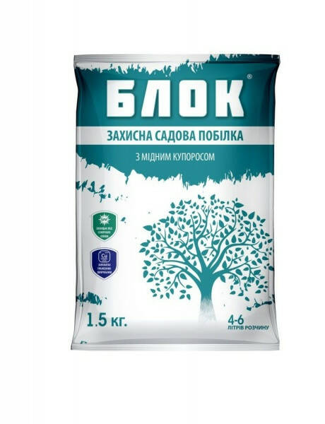 БЛОК побілка захисна садова з мідним купоросом — вміст сульфату міді забезпечує профілактику грибкових захворювань дерев, дезинфікує пошкодження та пришвидшує загоєння кори. Порядок застосування: Очищення стовбура і гілок На стовбурах і великих гілках дерев за вегетаційний період утворюються шари розтрісканої і відмерлої кори, за якою ховається безліч шкідників (яйця, личинки, лялечки, дорослі особини шкідливих комах, кліщі, спори грибів-паразитів). Таку кору потрібно зчищати спеціальним скребком або дротяною щіткою зверху вниз. Щоб паразити не падали на землю і потім знову не заражали рослину, під деревом розстеляють якийсь матеріал. Після завершення роботи сміття спалюють. Приготування робочого розчину Для приготування побілки вміст упаковки висипати в ємність об’ємом не менше 6-ти літрів. Розчинити цю суміш в 2-х літрах води та дати настоятись не менше 30-ти хвилин. У залежності від потреби в густині побілки, ретельно перемішуючи, довести об’єм робочого розчину до 4-6 літрів. Побілка Роботу потрібно проводити в суху погоду, коли температура повітря знизиться до 5-10 °С. Для побілки використовується щітка, розмір якої залежить від товщини стовбурів.