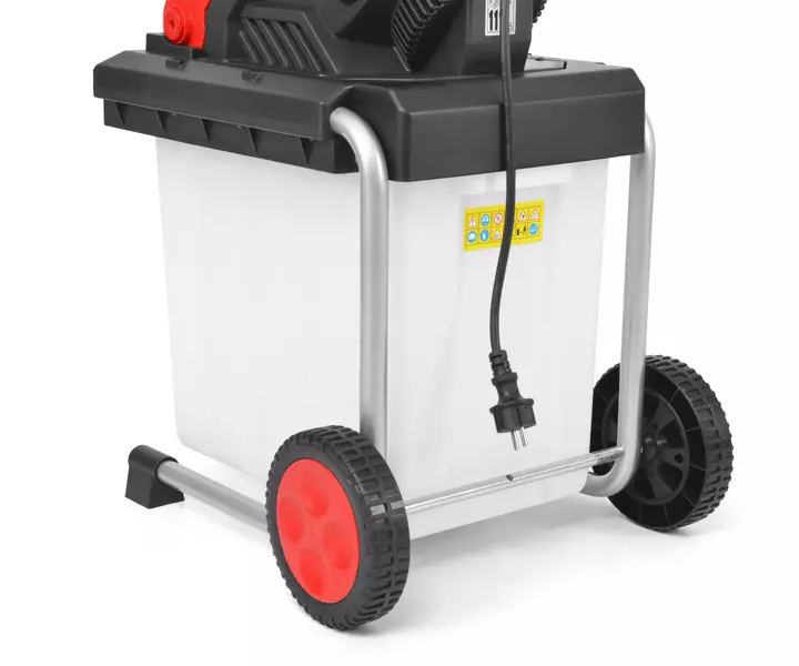 Електричний садовий подрібнювач з вагою 15 кг можна легко розмістити там, де це необхідно для двох стійких коліс на шасі. Збірна коробка зроблена з міцного пластику, її можна зняти з направляючої і висипати в ємність для компосту.
