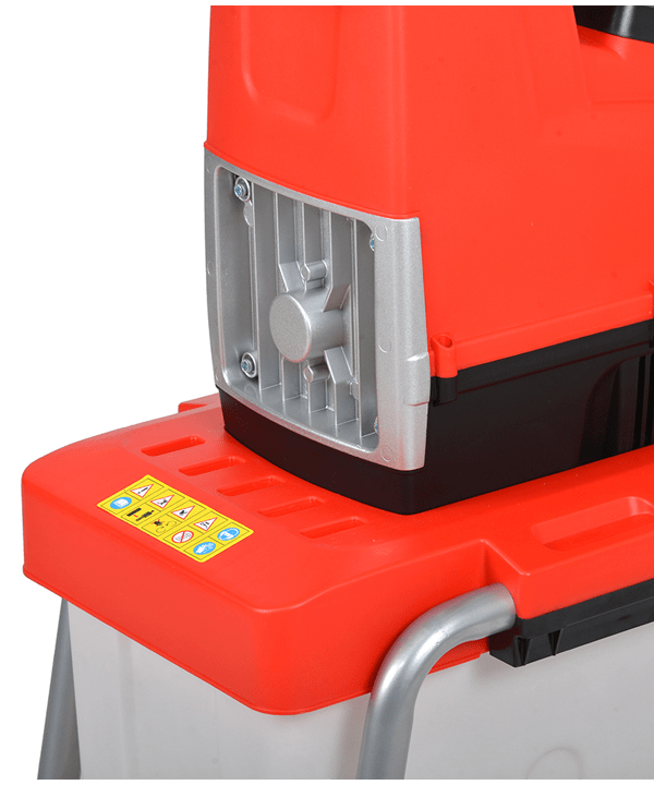 На верхній частині подрібнювача встановлений перемикач для прямого і зворотного ходу для вивільнення ролика від застряглого гілля. Перероблений матеріал збирається в 60-літровій бункер, що вставляється під шредер.