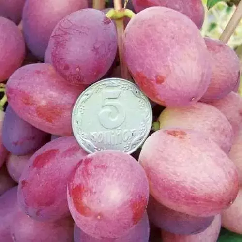 Виноград сверхраннего сорта созревания созревания на 7-10 дней раньше Супер Экстры. Гроздь крупная — 1000-2000 грамм, цилиндроконическаой формы, средней плотности. Ягода большая 8-10 г, яйцевидной формы, насыщенно розовая. Мякоть мясистая, семян в ягоде 1-2 шт. Транспортабельность высокая. На годичных кустиках урожай винограда 2-3 кг. Устойчивость к болезням выше средней, проявил не плохую стойкость к грибковым заболеваниям. Морозостойкость до -23ºС.