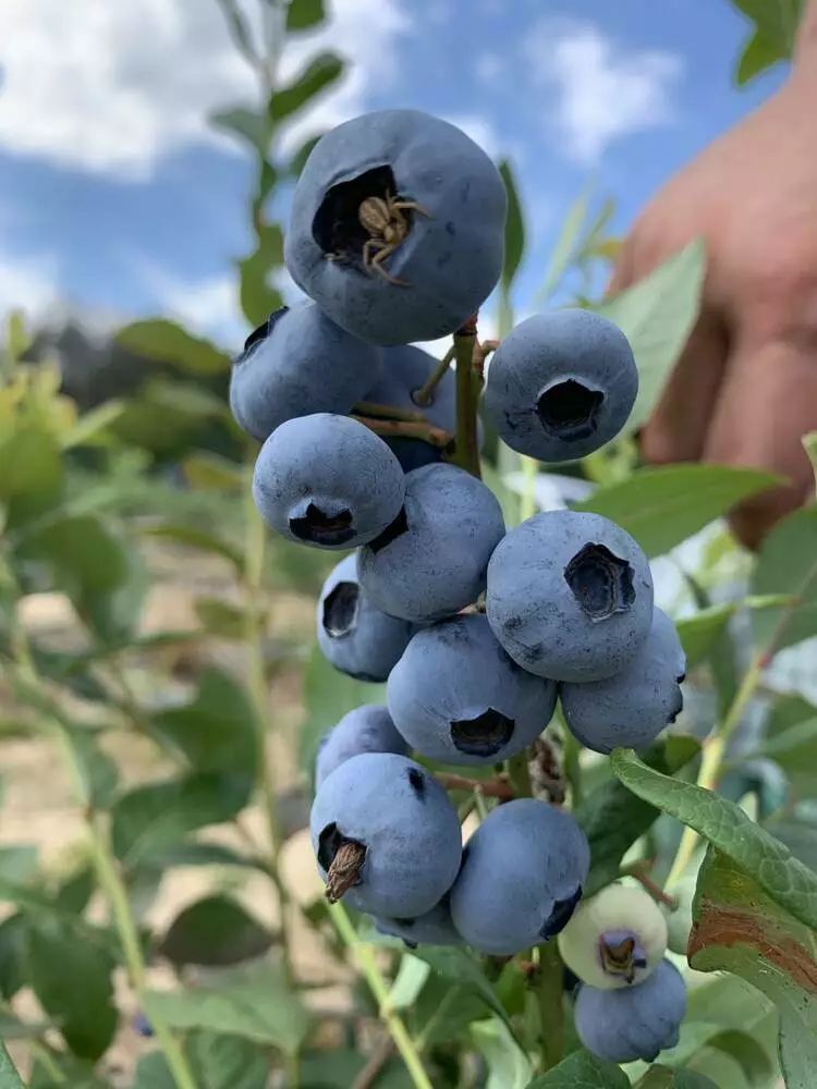 Ягоди округло-сплющеної форми з невеликою оцвітиною. Розмір від середніх до сильнокрупних. Діаметр 1,8 – 2 см, але можуть бути і 2,5 – 3 см. Середня вага 1,8 – 2,5 г, а в дуже великих досягає 3,5 г. Плоди високоякісні, щільні, пружні з соковитою зеленою м’якоттю. Забарвлення світло синього кольору з сильним нальотом.
