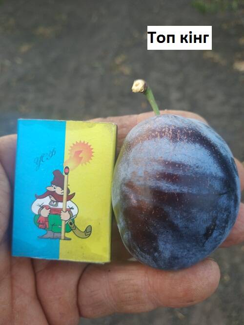 Слива Топ кінг- угорка. Дозріває сорт наприкінці вересня – на початку жовтня. Плоди дуже великі, масою близько 100 г, темно-синього кольору з білим нальотом, чудового солодкого смаку. Форма плодів – яйцеподібна. М'якуш жовтий, соковитий. Добре відокремлюється кісточка. Транспортабельність плодів висока.