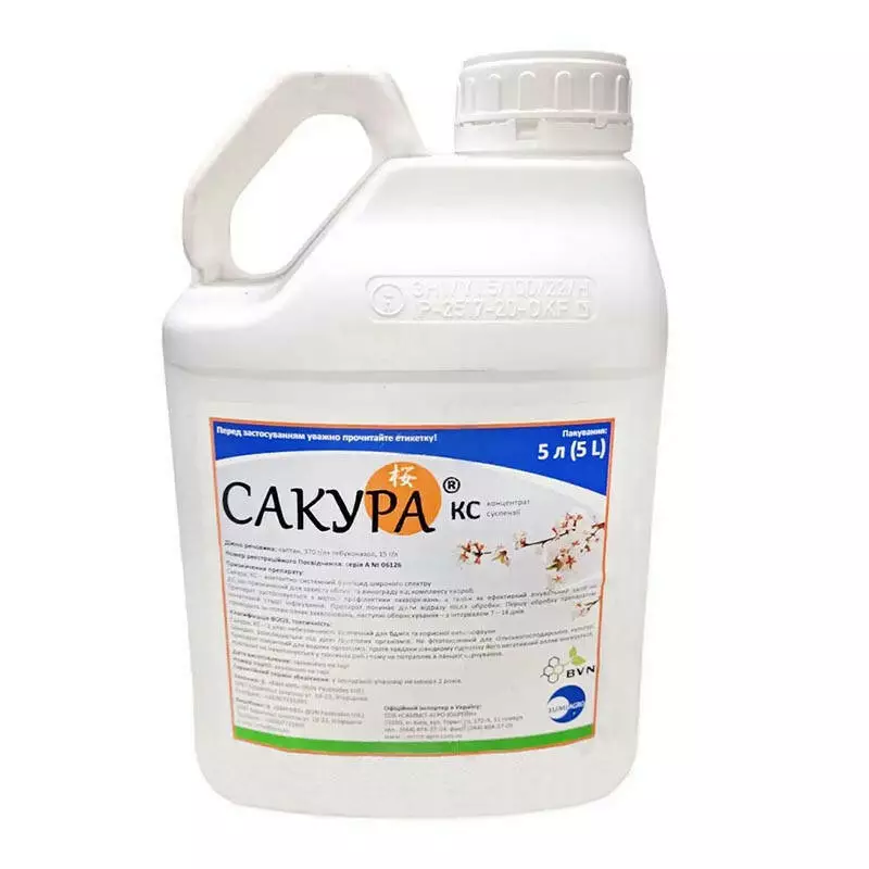Сакура К.С являється контактно-системним фунгіцидом  широкого спектру дії і призначений для захисту яблуні та виноградників від комплексу хвороб. Активні інгредієнти, що входять до складу фунгіциду Сакура , належать до різних хімічних груп та діють на патоген різними шляхами, завдаючи різних функціональних порушень життєдіяльності (пригнічення біосинтезу ергостеролу, активності ферментів, процесів дихання та порушення процесу ділення клітин патогену). Препарат Сакура застосовується для профілактики захворювань, а також як ефективний лікувальний та викорінювальний засіб на початковій стадії інфікування.